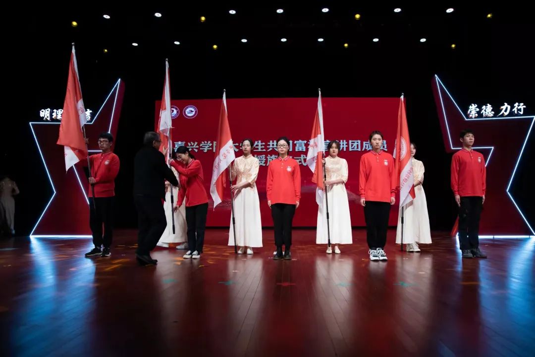 在嘉兴学院大学生共同富裕宣讲团成立仪式上,共青团浙江省委学校部副部长章豪锋为宣讲团指导教师颁发聘书,嘉兴学院党委副书记钱方明为宣讲团成员授旗。