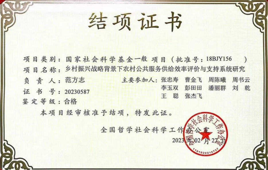 范方志教授主持的国家社科基金一般项目“乡村振兴战略背景下农村公共服务供给效率评价与支持系统研究”通过结项验收审批,顺利结项。