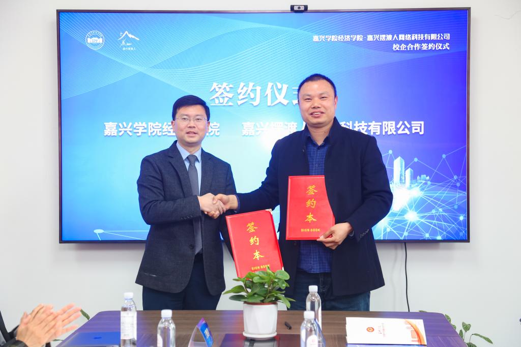 院长文雁兵和嘉兴摆渡人网络科技有限公司总经理王学成代表双方单位共同签署了《跨境电子商务人才培养校企合作协议》,并共同为“成人网