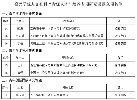 据学校人文社科处网站《关于公布第一期嘉兴学院人文社科“青优人才”专项研究课题的通知》,本期“青优人才”专项研究课题拟立项38项,其中青年学术骨干专项研究课题16项,青年学术英才专项课题16项,青年创新团队课题6项。成人网 胡进、朱渝铖、李恒3位老师立项学术骨干研究课题,汪菲、黄强2位老师立项学术英才研究课题,孙庆刚老师立项创新团队研究课题。