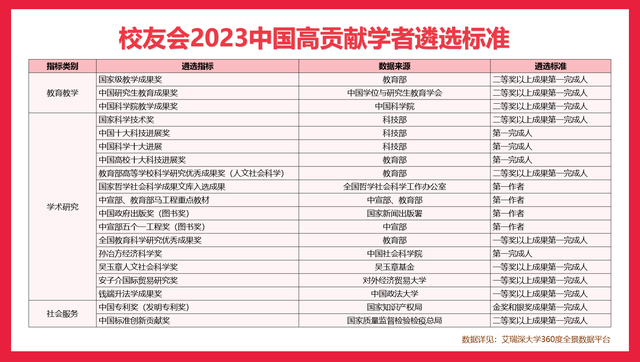 校友会中国高贡献学者榜单首发于2022年,是目前国内唯一从“教学科研贡献”角度遴选中国高校优秀学者的榜单。校友会中国高贡献学者遴选以中国学者对国家经济社会发展做出的系统性成就和贡献为基准,评价遴选标准涵盖了国家级教学成果奖、国家科学技术奖励、教育部高等学校科学研究优秀成果奖(人文社会科学)、国家哲学社会科学成果文库、中宣部五个一工程奖、中国专利奖、全国教育科学研究优秀成果奖和孙冶方经济科学奖等19项公认的权威评价指标,这是与中国高被引科学家、高被引学者仅从纯论文影响角度评价学者最大的不同。上榜学者均是在中国高等教育领域得到广泛认可的杰出学者,他们在教育教学、学术研究、技术创新与社会服务等方面做出了突出贡献,是在各自学科领域具有广泛学术影响力和核心竞争力的领军型人才,在中国大学“双一流”建设中发挥着重要的支撑引领作用。