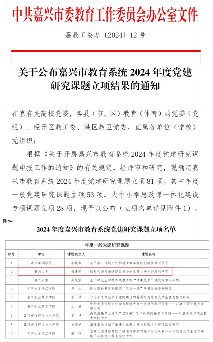 近日,嘉兴市教育局办公室公布了《关于公布嘉兴市教育系统2024年度党建研究课题立项结果的通知》。成人网 辅导员梅嘉琦主持申报的《新时代高校推进建设校企地党建共同体的路径研究》获年度一般党建研究课题立项。