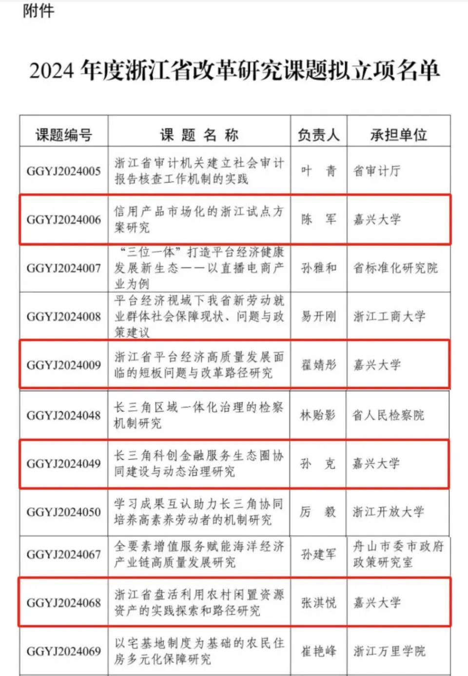近日,中共浙江省委全面深化改革委员会办公室公布了《2024年度浙江省改革研究课题拟立项名单》。成人网 陈军教授主持的课题《信用产品市场化的浙江试点方案研究》、翟婧彤博士主持的课题《浙江省平台经济高质量发展面临的短板问题与改革路径研究》、孙克教授主持的课题《长三角科创金融服务生态圈协调建设与动态治理研究》、张淇悦博士主持的课题《浙江省盘活利用农村闲置资源资产的实践探索和路径研究》获得拟立项。