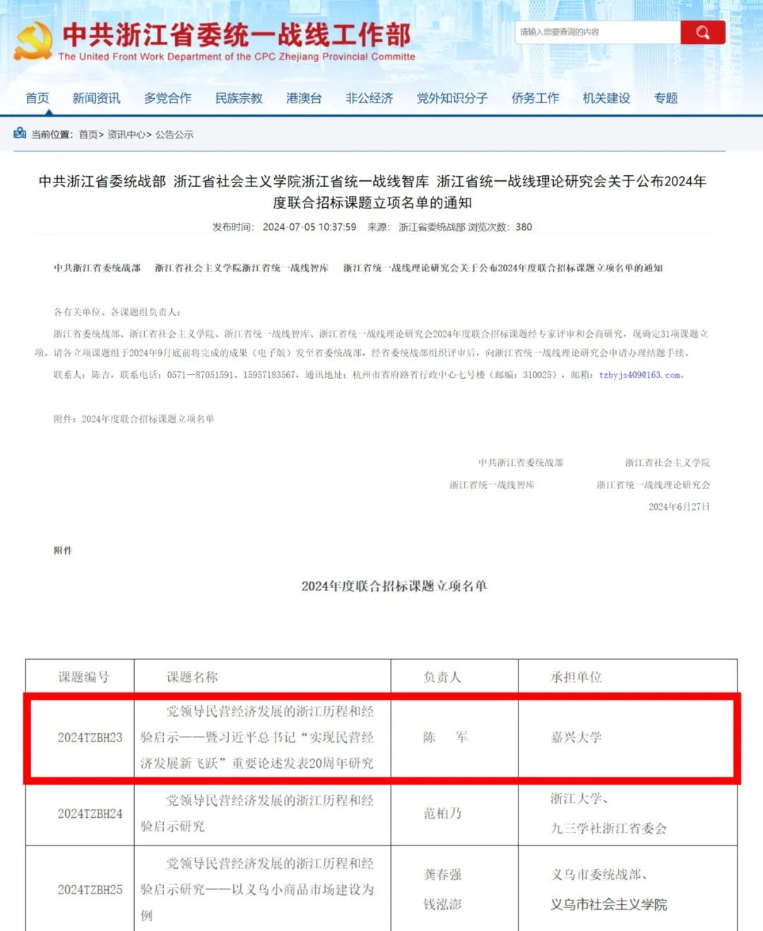 近日,中共浙江省委统战部、浙江省社会主义学院、浙江省统一战线智库、浙江省统一战线理论研究会公布了2024年度联合招标课题立项名单,成人网 陈军教授的课题《党领导民营经济发展的浙江历程和经验启示——暨习近平总书记“实现民营经济发展新飞跃”重要论述发表20周年研究》成功立项。