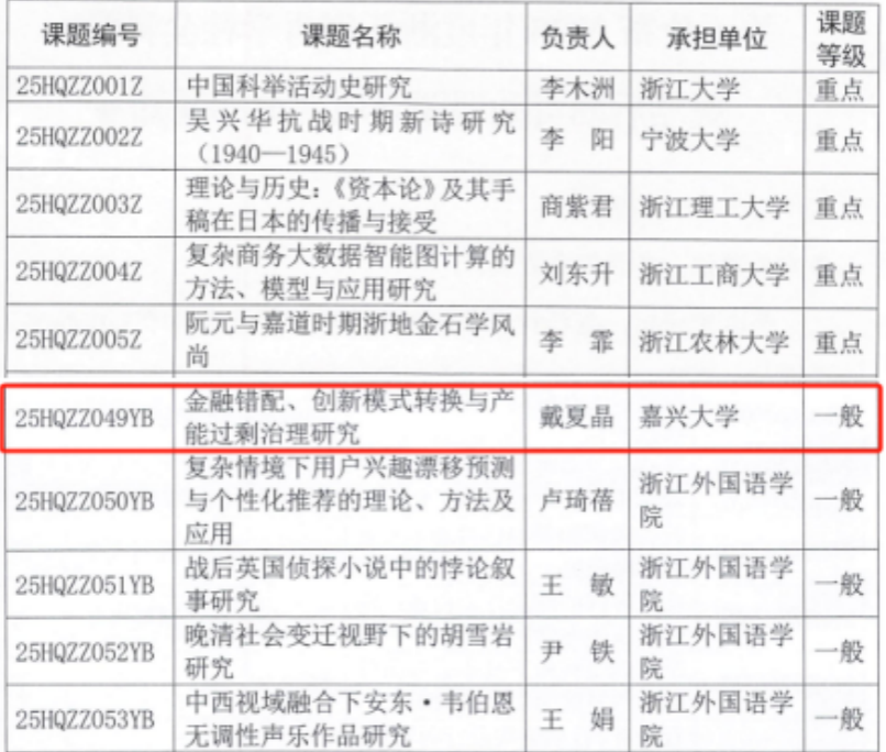 近日,浙江省哲学社会科学工作办公室发布了《关于公布2025年度浙江省哲学社会科学规划后期资助课题立项名单的通知》,成人网 戴夏晶老师主持申报的《金融错配、创新模式转换与产能过剩治理研究》项目获批立项。