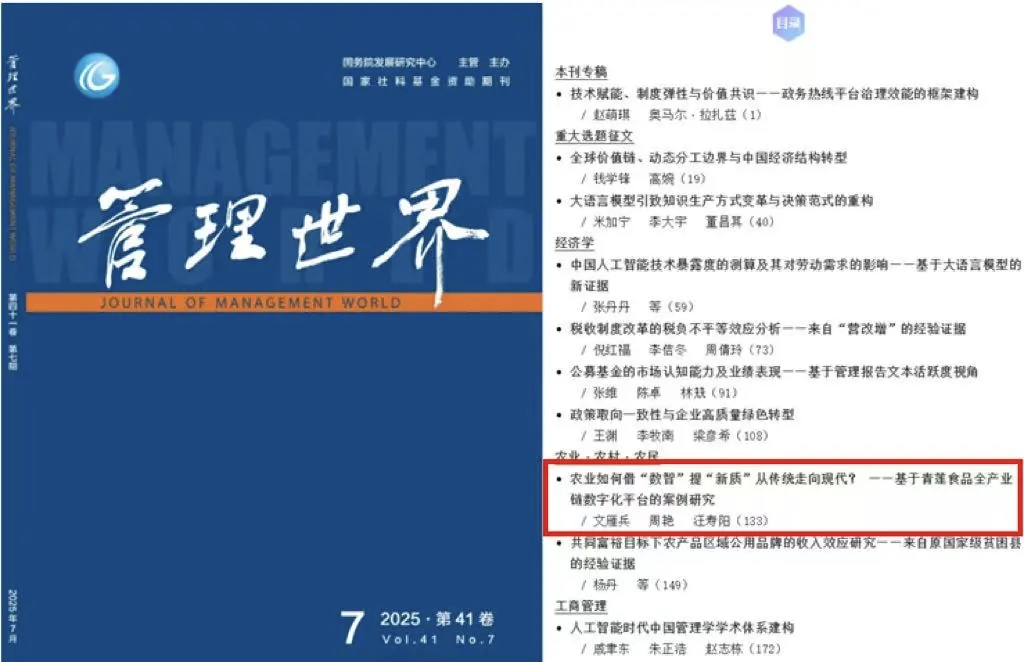 文雁兵教授、周艳副教授与汪寿阳教授(中国科学院大学经济与管理学院、上海科技大学创业与管理学院)合作论文《农业如何借“数智”提“新质”从传统走向现代?——基于青莲食品全产业链数字化平台的案例研究》在权威期刊《管理世界》2025年7月刊正式发表。文雁兵教授为论文第一作者,周艳副教授为论文通讯作者,成人网