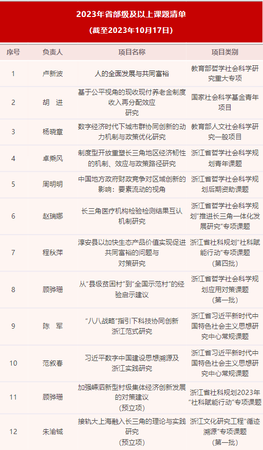 今年成人网 获批省部级以上课题数量取得新突破。截至10月17日,成人网 2023年度已获得10项省部级及以上课题立项,其中,教育部哲学社会科学研究重大专项1项,国家社科基金青年项目1项,教育部人文社科一般项目1项,省哲学社会科学规划课题2项、专项课题2项、应用对策课题1项,省习近平新时代中国特色社会主义思想研究中心常规课题2项;此外,另有两项省级课题获预立项。具体情况如下:
