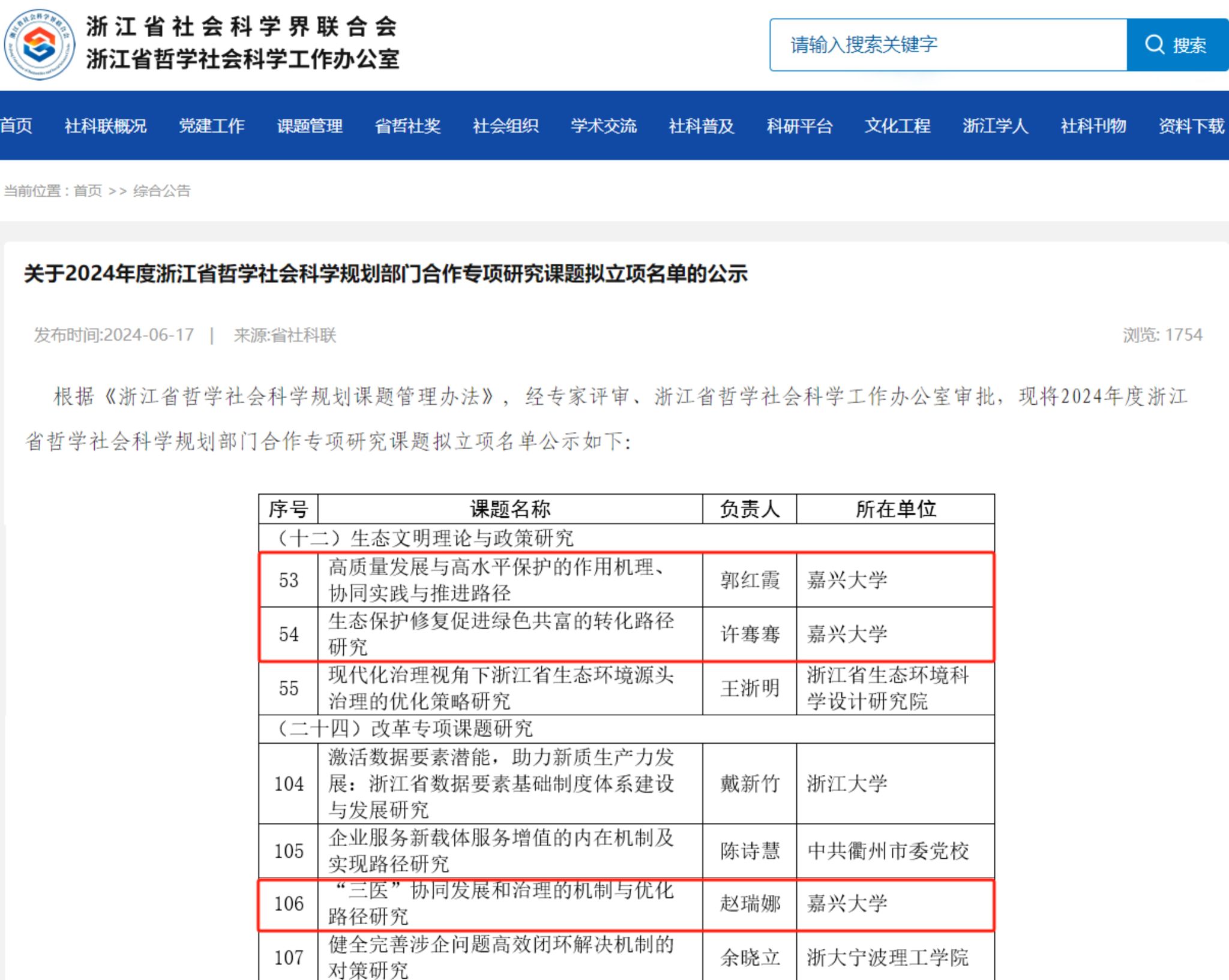 近日,浙江省哲学社会科学工作办公室公布了《关于2024年度浙江省哲学社会科学规划部门合作专项研究课题拟立项名单的公示》。成人网 郭红霞博士主持的课题《高质量发展与高水平保护的作用机理、协同实践与推进路径》、许骞骞博士主持的课题《生态保护修复促进绿色共富的转化路径》、赵瑞娜博士主持的课题《“三医”协同发展和治理的机制与优化路径研究》获得拟立项。