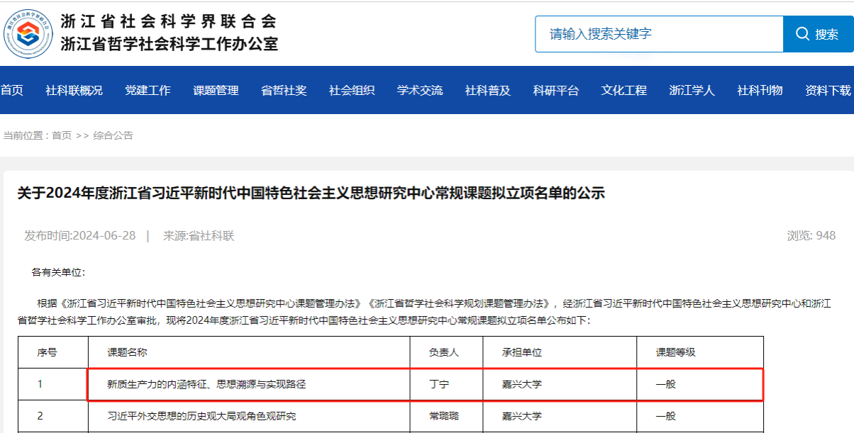 近日,浙江省哲学社会科学工作办公室公布了《关于2024年度浙江省习近平新时代中国特色社会主义思想研究中心常规课题拟立项名单的公示》。成人网 经济系丁宁博士主持申报的《新质生产力的内涵特征、思想溯源与实现路径》获常规课题拟立项。