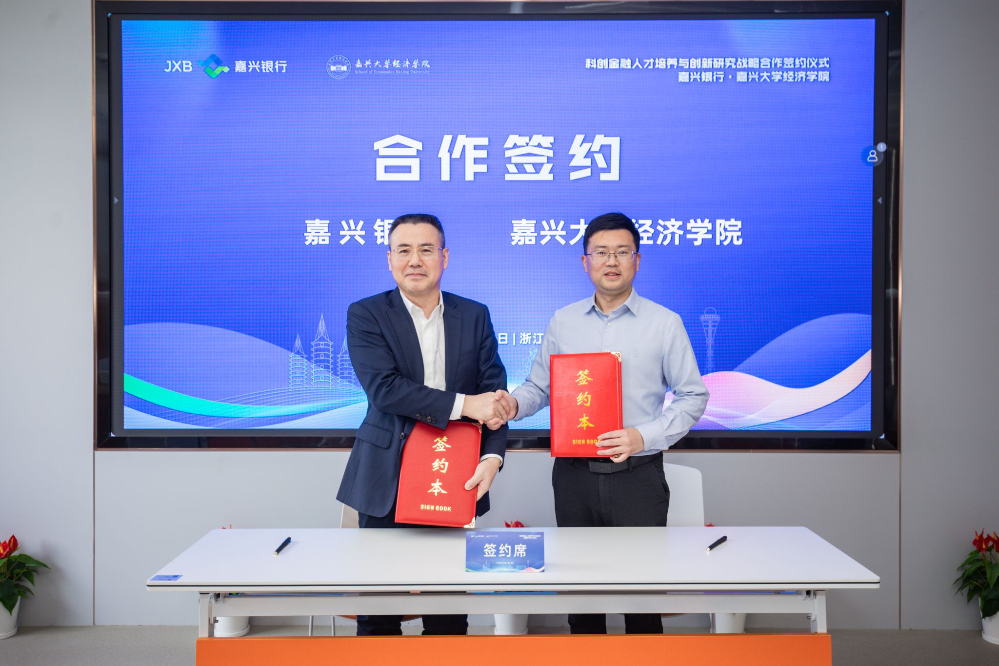 学院院长文雁兵和嘉兴银行党委副书记、行长章张海代表双方单位共同签署《嘉兴银行和成人网 有关金融人才培养和科创金融研究合作协议》。