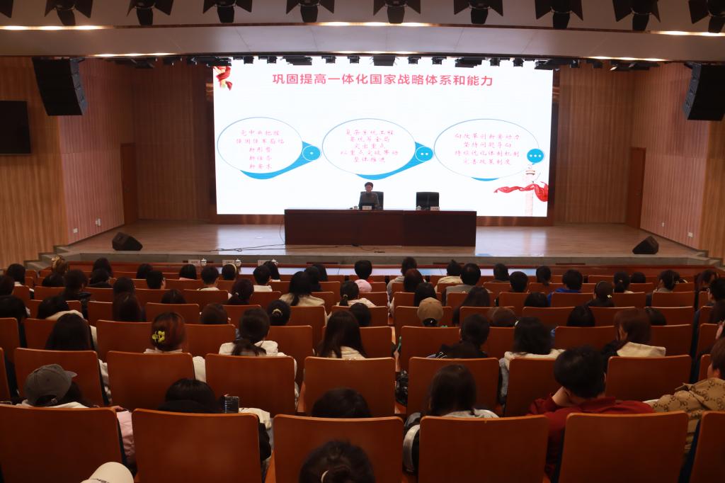 此次全国两会,是党的二十大后召开的第一次全国两会, 张齐结合参加全国两会的个人经历,从会议概况、总书记重要讲话精神、政府工作报告、全国人大常委会工作报告、选举工作、国务院机构改革方案、代表审议工作及履职感受八个方面围绕两会精神展开。她表示,会议提交议案271件、提出建议8000多件、18位基层代表直面媒体传递百姓声音,充分体现了全过程人民民主的真谛;会议明确了五个新的变化,即政坛新阵容、经济新开局、民主新叙事、开放新举措、因应新变局,同时牢牢把握高质量发展这一项首要任务,确保全面建设社会主义现代化国家开好局起好步。她鼓励同学们,要深刻理解和把握“两会精神”,顺应时代变化、抓住时代机遇,做有理想、敢担当、能吃苦、肯奋斗的新时代好青年。