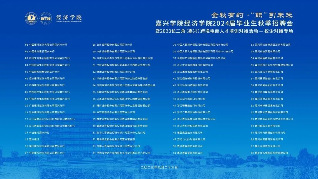 2024届秋季招聘会在梁林校区学术报告厅举行。这是学院面向2024届毕业生的第一场行业类专场招聘会(金融机构以及外贸类岗位),吸引了中国工商银行嘉兴分行、中国农业银行嘉兴分行、中信证券股份有限公司嘉兴分公司、中国人寿保险股份有限公司、浙江吉利控股集团、嘉兴国贸云商供应链管理有限公司等68家金融类及综合企业、进出口企业参与,发布用人需求500余个。