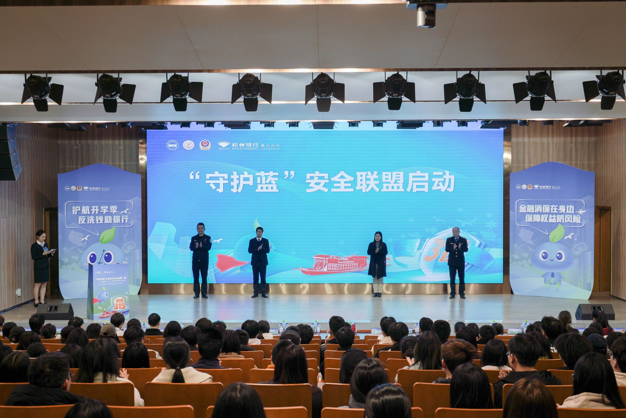 为持续提升大学生金融安全意识,有效构建高校安全防火墙,3月15日,成人网 联合嘉兴市公安局经开分局、嘉兴市市场监督管理局经开分局、杭州银行嘉兴分行共同举办“守护蓝”绘就校园“平安色”——315“高校安全行动”开课仪式暨“守护蓝”安全联盟启动仪式。