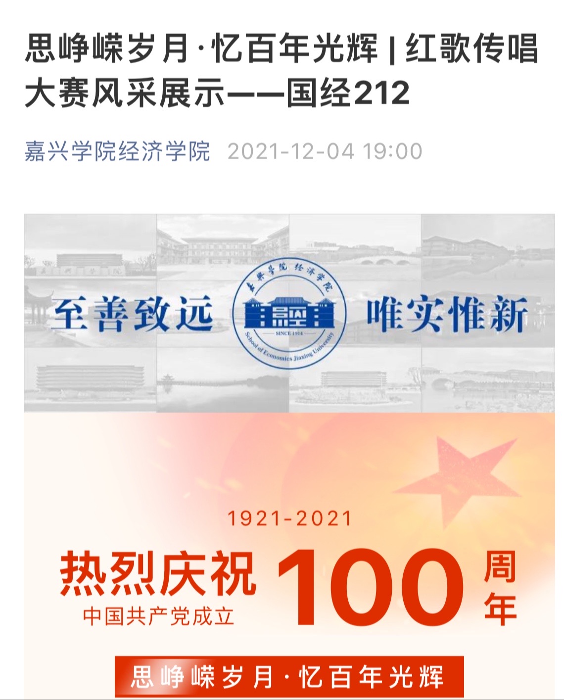 为庆祝建党100周年,讴歌中华民族百年奋斗历程,唱响中国共产党建设社会主义伟大祖国的优美主旋律,培养广大同学的爱国主义思想,增强使命感、责任感和荣誉感,充分展现经院学子良好的精神风貌,成人网 团委举办了思峥嵘岁月·忆百年光辉线上红歌传唱大赛。