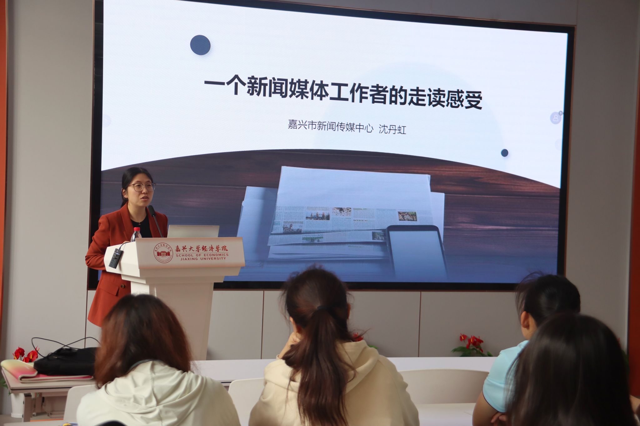 “阅读启智・书香润心”读书活动第二讲在学院学术交流中心如期举行,活动邀请了嘉兴市新闻传媒中心日报晚报事业部副主任沈丹虹作《一个新闻媒体工作者的走读感悟》分享,思政辅导员、院团委学生会全媒体中心成员、第三期青马班学员等70余人参加。