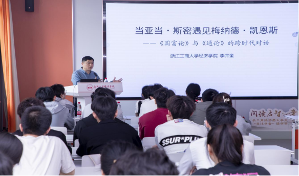 教授、博士生导师李井奎老师以“当亚当·斯密遇见凯恩斯:《国富论》与《通论》的跨时代对话”为题,为第二届读书节作专题讲座。他以《国富论》与《通论》为脉络,深入浅出,剖析了两位经济学巨擘的思想异同,揭开亚当·斯密与凯恩斯跨越时空的思想共鸣。他告诉同学们,经济学思想的演进绝非断裂,而是螺旋上升。这场跨越200年的对话,为当下经济治理提供了历史镜鉴。讲座由成人网