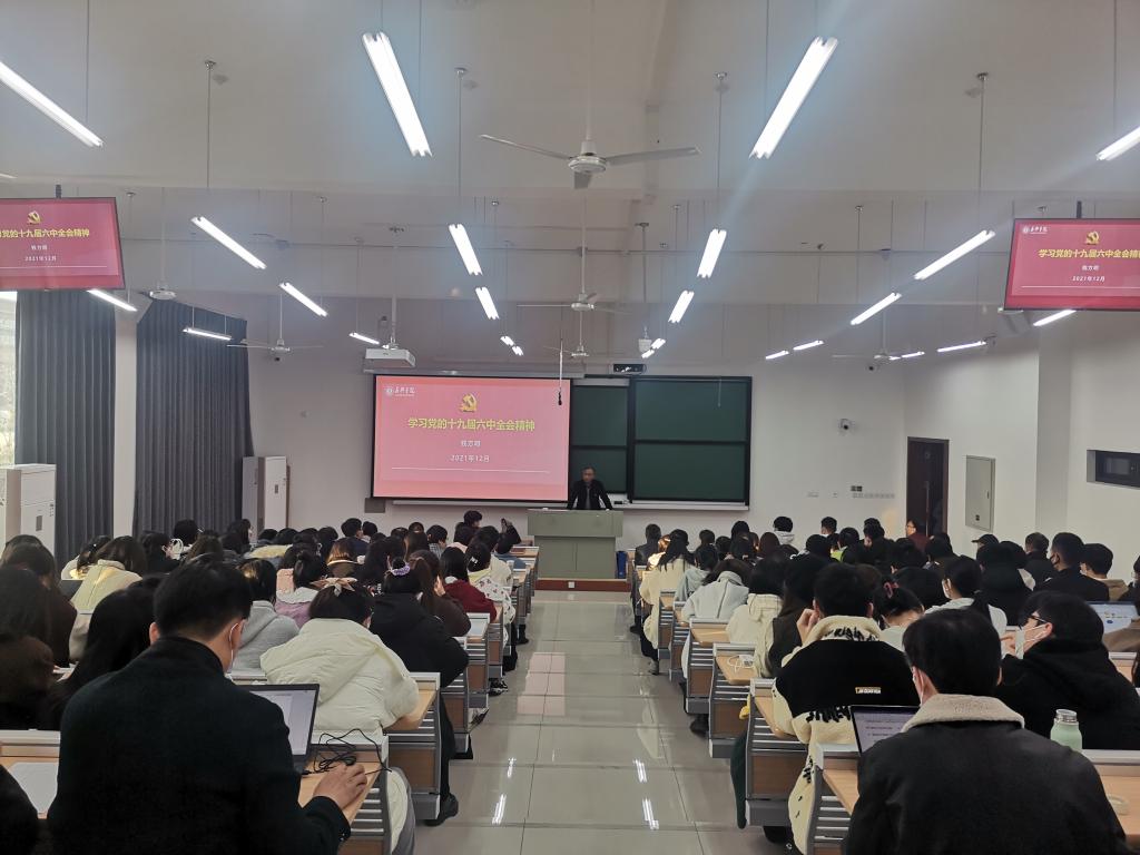 2021年12月9月下午,校党委副书记钱方明来院进行党的十九届六中全会精神宣讲,宣讲会由学院党委书记施敏颖主持,全院教师及学生代表参加了本次宣讲活动。