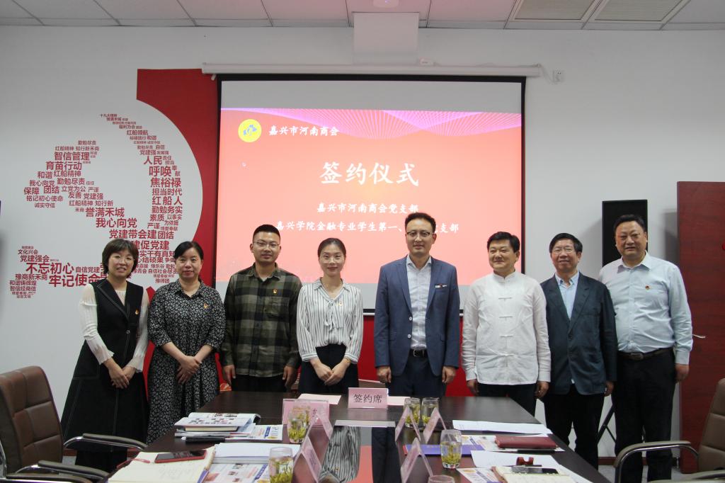 5月19日,成人网 金融专业学生第一、第二党支部与嘉兴市河南商会党支部举行结对签约仪式,共同打造“校会企”党建工作新模式。嘉兴市河南商会会长李永宪,商会副会长、党支部书记吕丹,成人网 党委书记施敏颖,党委副书记庄美燕及双方代表出席签约仪式。仪式由商会党支部党务红领、秘书长刘高宪主持。