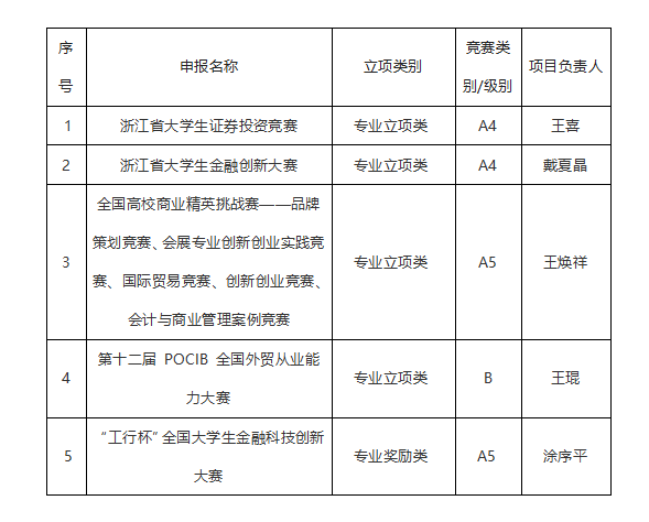 根据学校教务处《关于申报2023年嘉兴学院大学生科技竞赛项目的通知》要求,经项目组负责人申报、学院审核评定,拟推荐专业立项类项目4项、专业奖励类项目1项为2023年嘉兴学院大学生科技竞赛项目,现予以公示如下:
