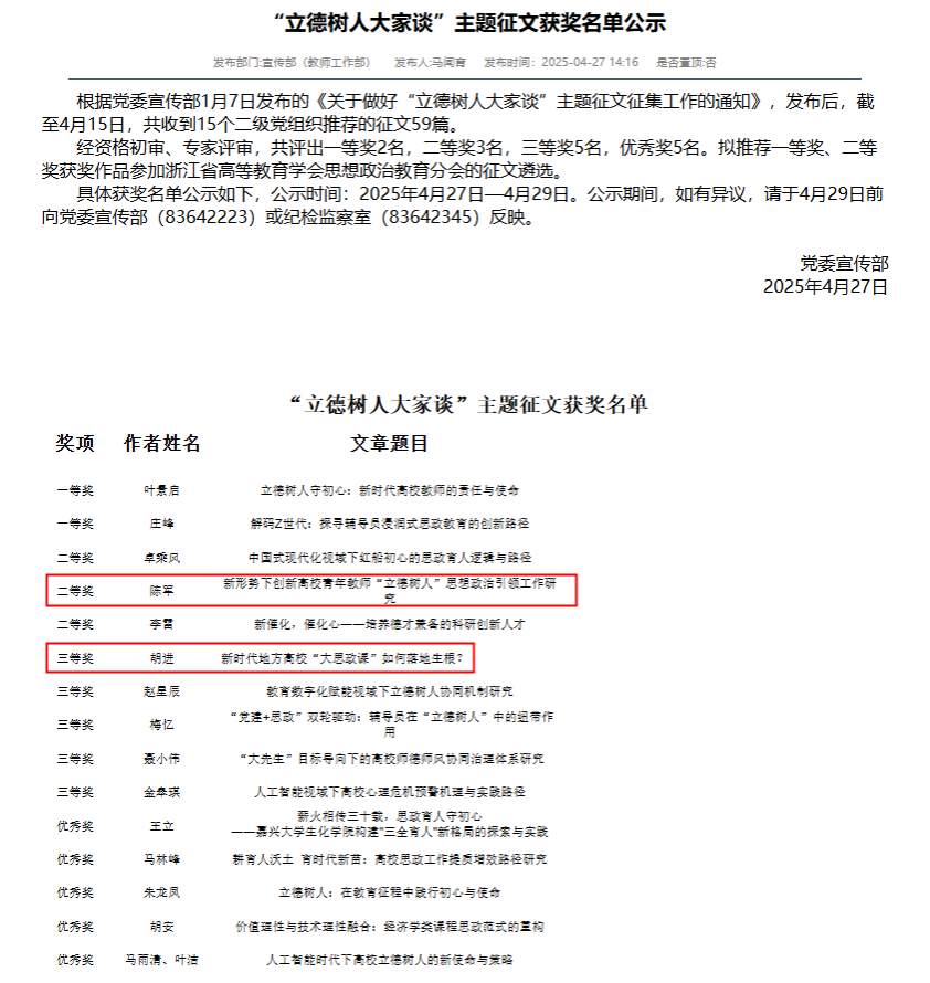 支部党员陈军教授以《新形势下创新高校青年教师“立德树人”思想政治引领工作研究》为题,针对高校青年教师群体的思想政治教育痛点,提出“双向赋能、精准滴灌”的工作路径,获评二等奖。支部党员胡进副教授以《新时代地方高校“大思政课”如何落地生根?》为题,紧贴思政教育实践,结合地方高校办学特点,从课程设计、资源整合、评价机制等维度提出创新方案,获评三等奖。